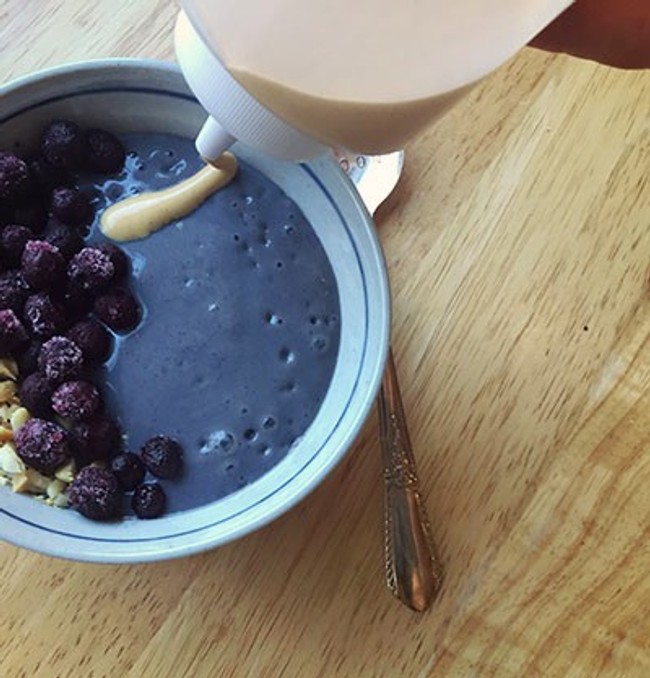 The beauty of using powdered peanut butter is that you can make it as thick or thin as you like by adjusting the water or adding more powder. I started with two heaping tablespoons of peanut butter powder and added about one tablespoon of water. Then I added more water until it was the consistency I was looking for. In addition, I added a touch of honey and cinnamon to complement the flavors of the smoothie bowl. In this case, I was looking for a thinner consistency so that it almost melted into the smoothie bowl. Again, flawless.