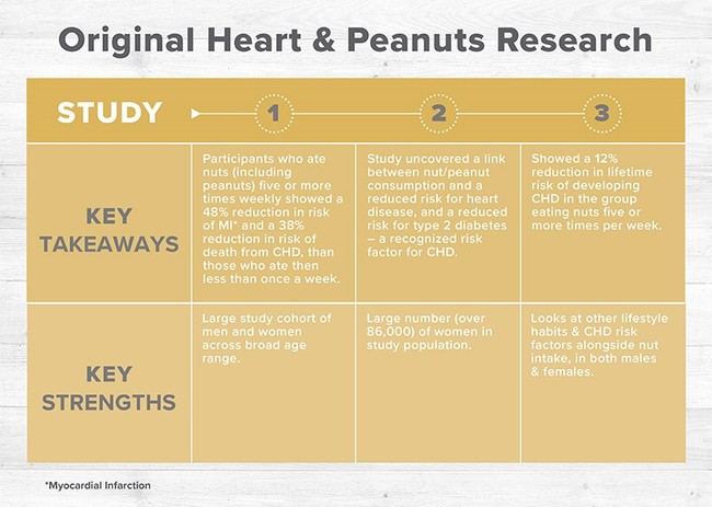 Since the 90’s, peanuts have a qualified health claim that says: Scientific evidence suggests, but does not prove that eating 1.5 ounces per day of most nuts, including peanuts, as part of a diet low in saturated fat and cholesterol may reduce the risk of heart disease.
